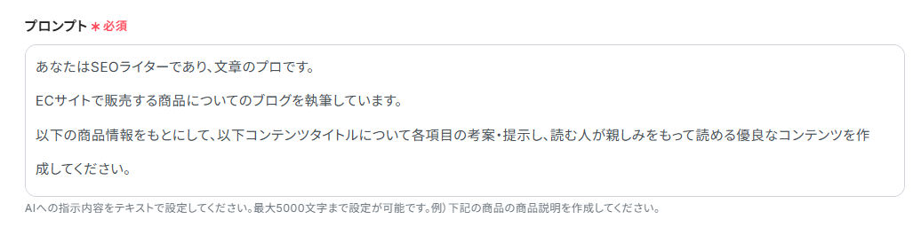 「プロンプト」は、Jotformで取得した回答をもとにして、AIへの指示内容を設定します。 指示は、テンプレートを活用して、以下画像のように入力しています。