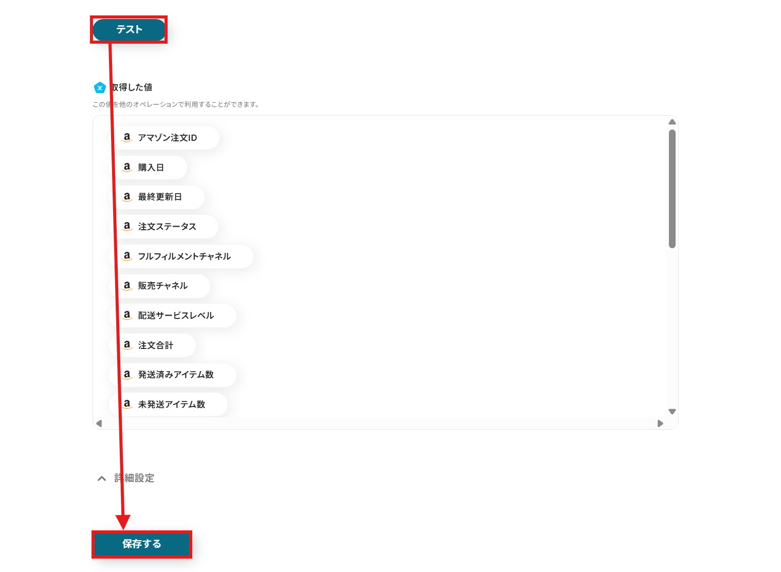 内容を確認した後、「テスト」をクリックして動作を確かめます。