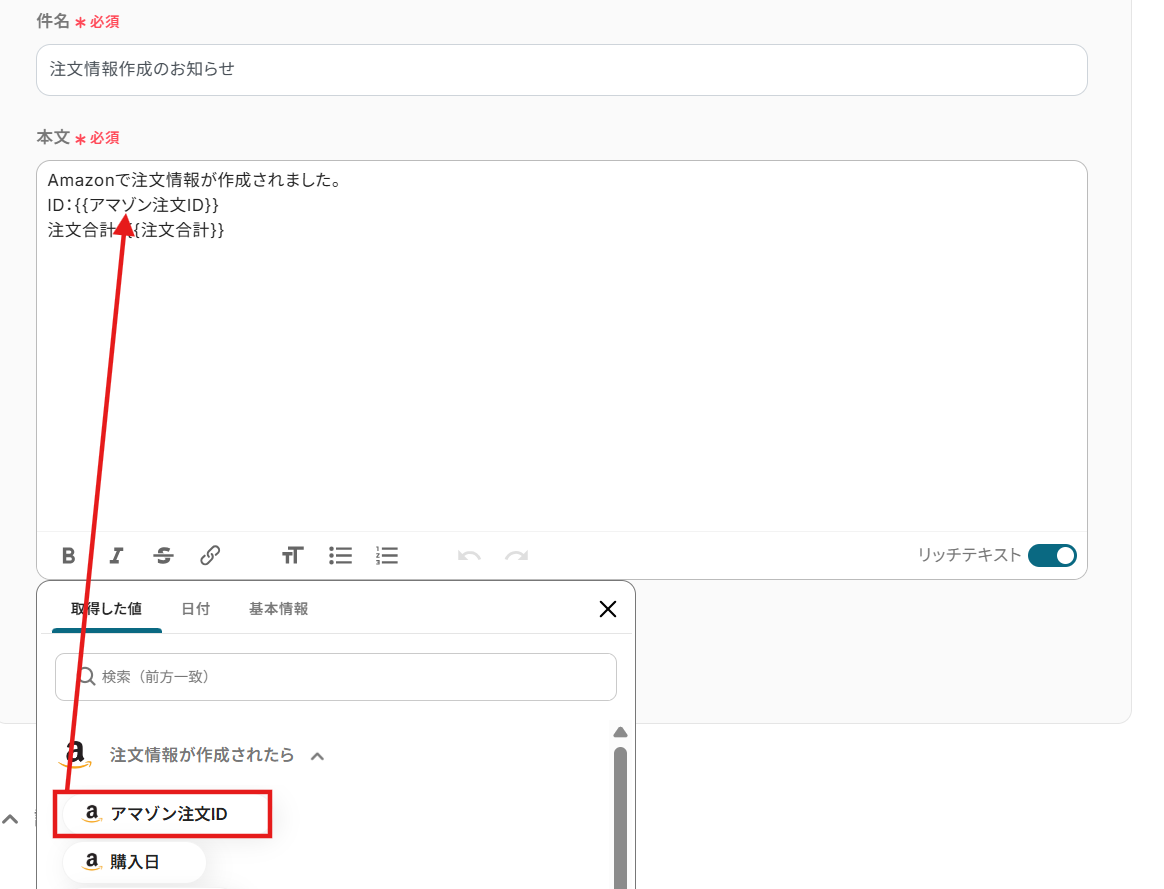件名、本文は編集欄をクリックすると、先ほど取得した情報が表示されます。ファイル名など、必要に応じて活用してくださいね。