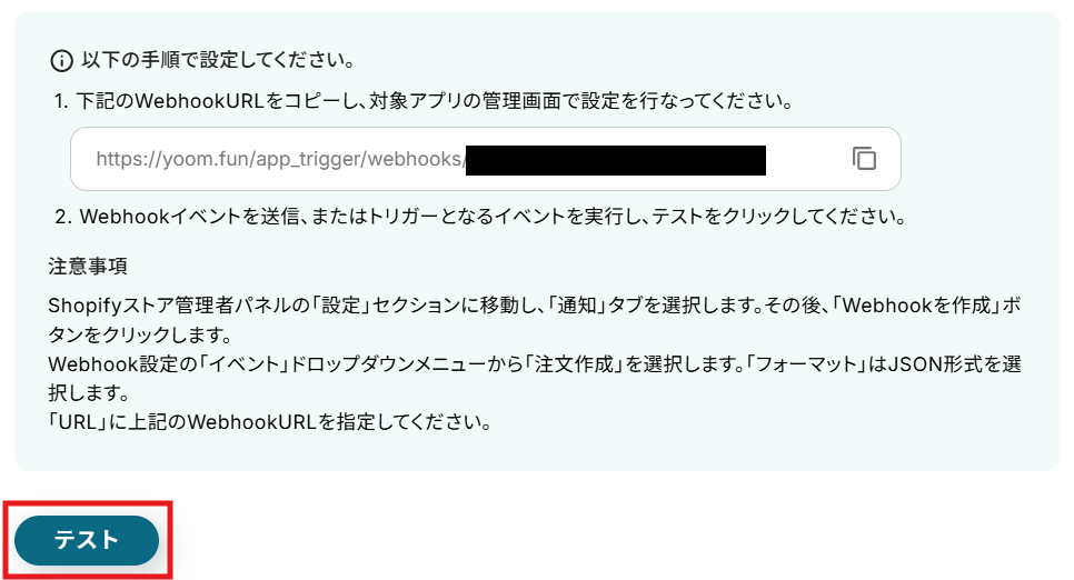 注文の作成が完了したら、Yoomの操作画面に戻り、「テスト」をクリックしてください。