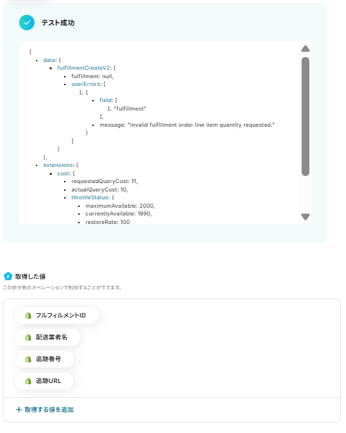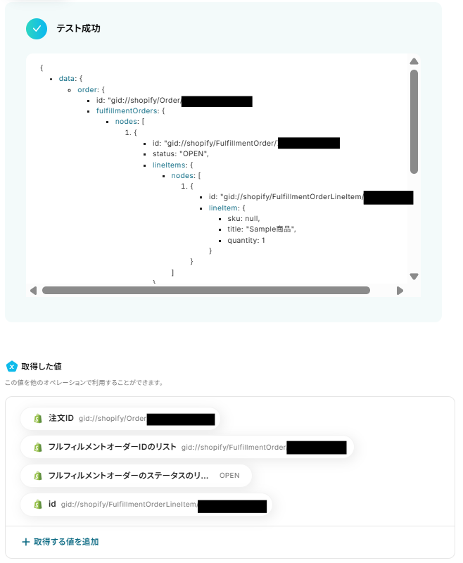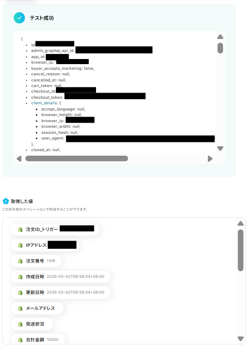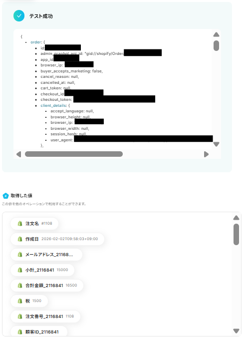 テストが成功すると、取得した値の横に、Shopifyで作成した注文情報が表示されます。
