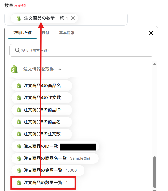 編集欄をクリックし、「注文情報を取得」から「注文商品の数量一覧」を選択します。