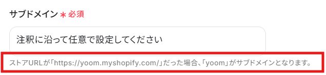 - Shopifyの各アクション設定において、連携対象となるご自身のストアのサブドメインを任意で設定してください