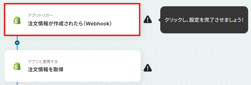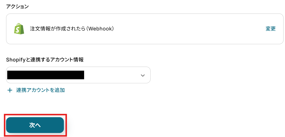 アクションは、「注文情報が作成されたら(Webhook)」のままで次に進みましょう!