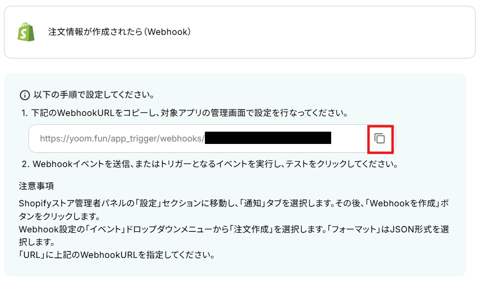 赤枠内をクリックしてWebhookURLをコピーしたら、Shopifyに移動してください。