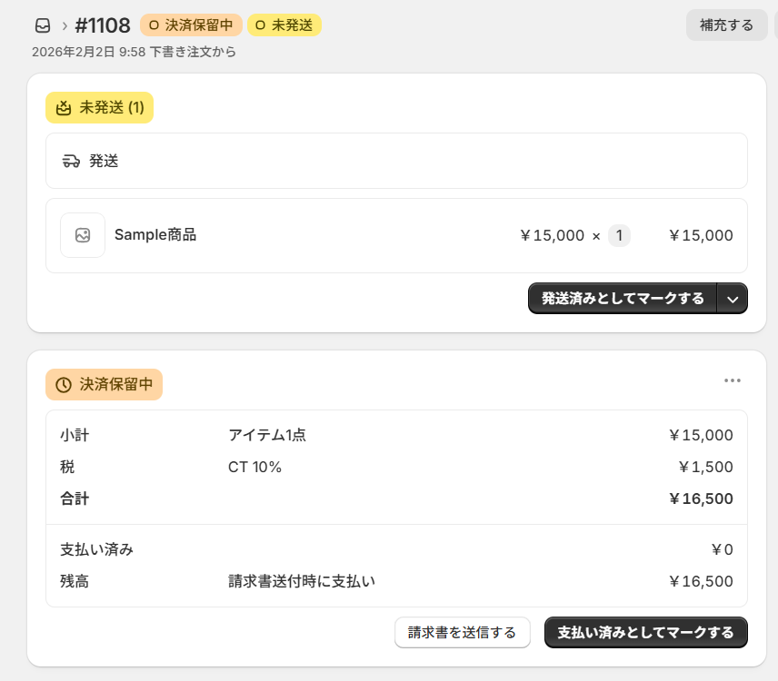 Webhookの設定が完了したら、テスト用の注文を作成しましょう。