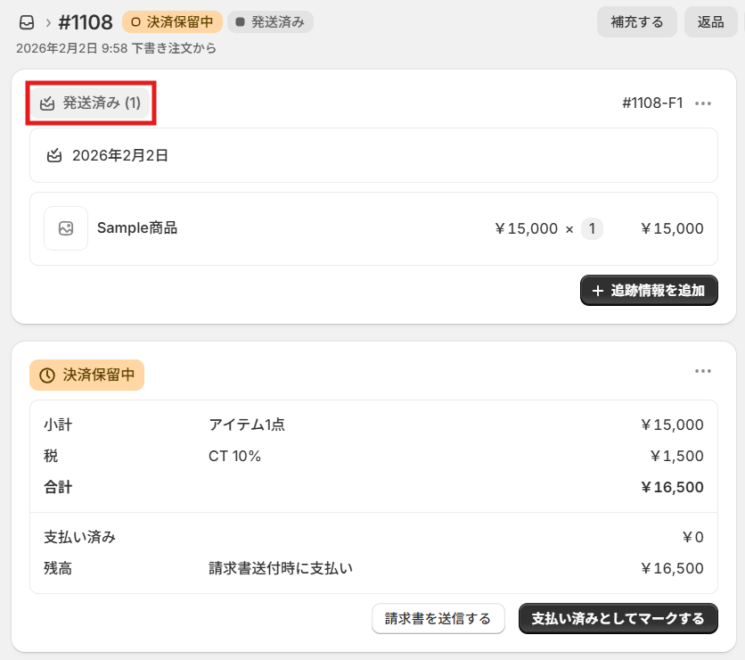 フルフィルメントが作成され、Shopifyの注文情報が「発送済み」に変更されました!