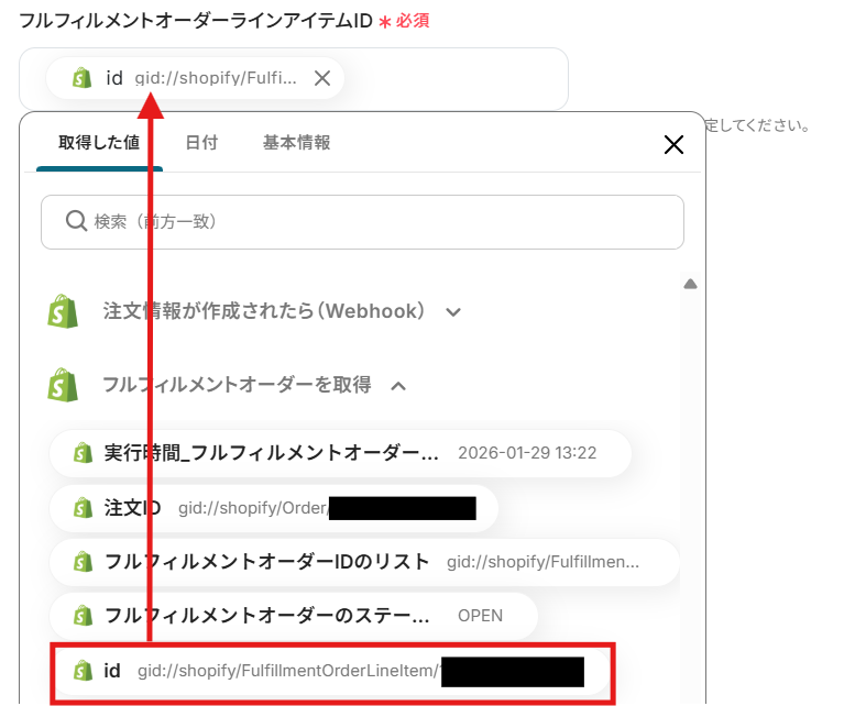 編集欄をクリックし、「フルフィルメントオーダーを取得」から「id」を選択します。