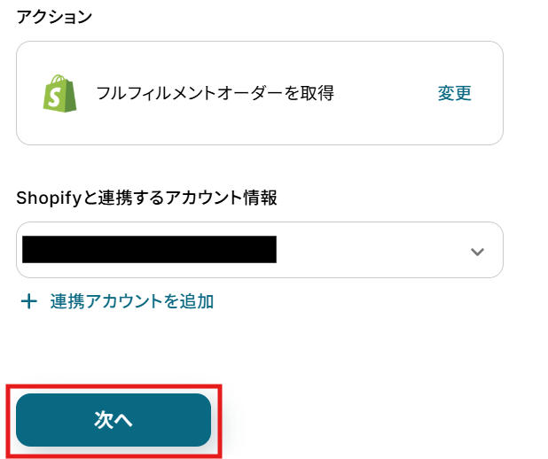 アクションは、「フルフィルメントオーダーを取得」のままで次に進みましょう!