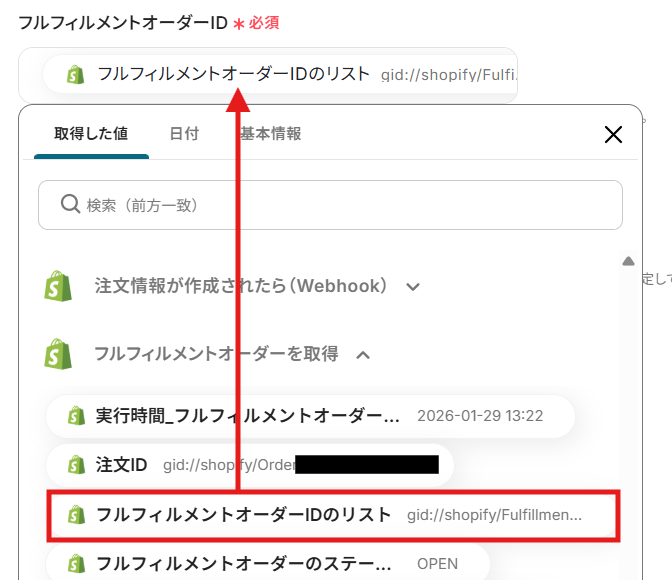 編集欄をクリックし、「フルフィルメントオーダーを取得」から「フルフィルメントオーダーIDのリスト」を選択します。