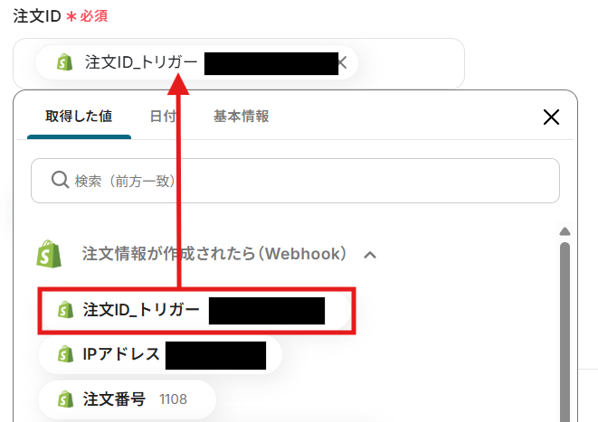 編集欄をクリックし、「注文情報が作成されたら(Webhook)」から「注文ID_トリガー」を選択します。
