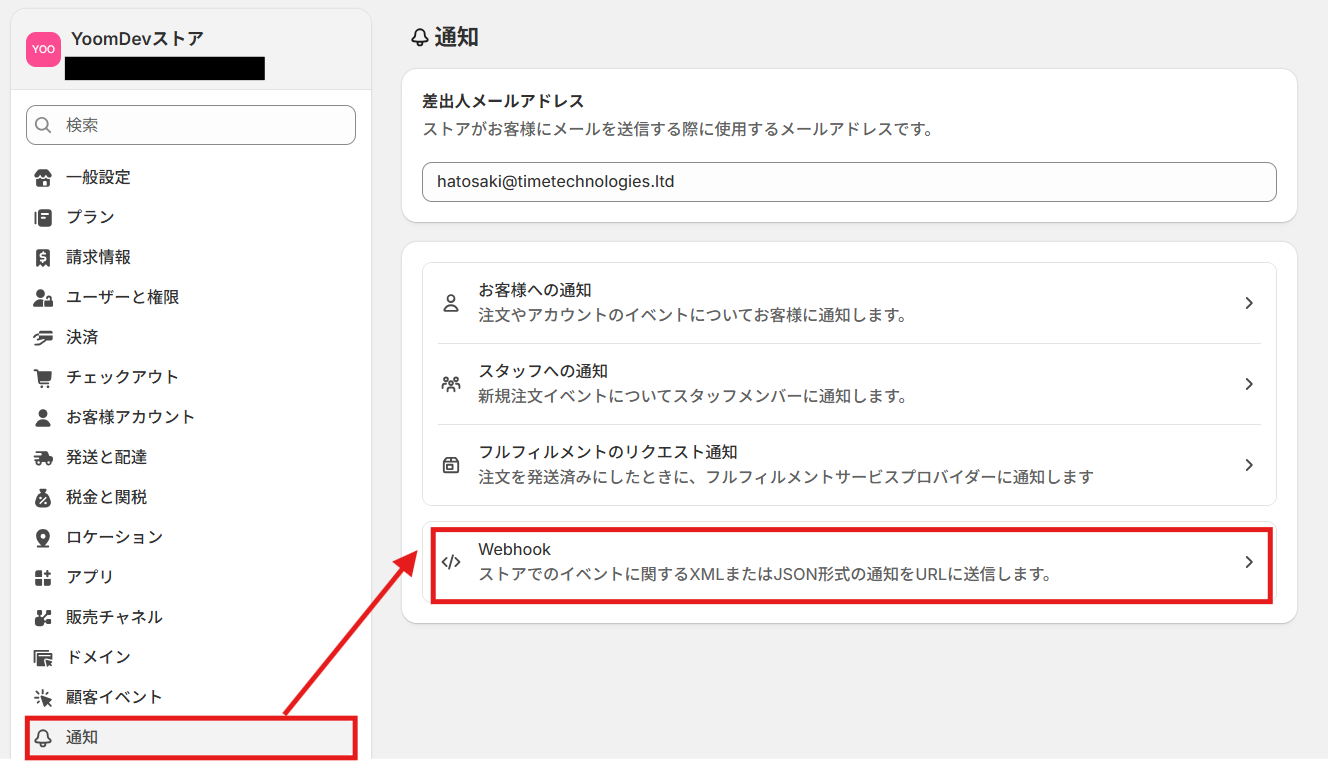 Shopifyにログインしたら設定セクションを選択し、「通知」から「Webhook」を選びます。