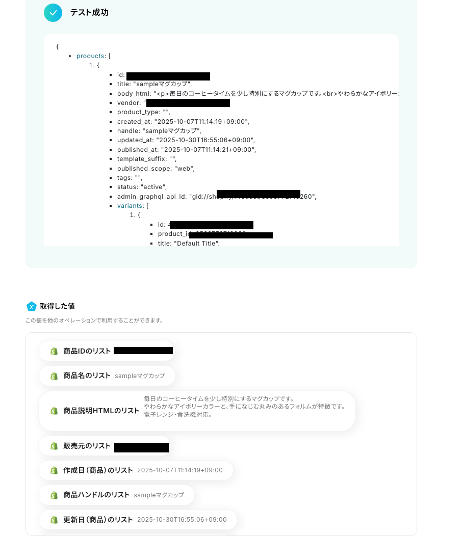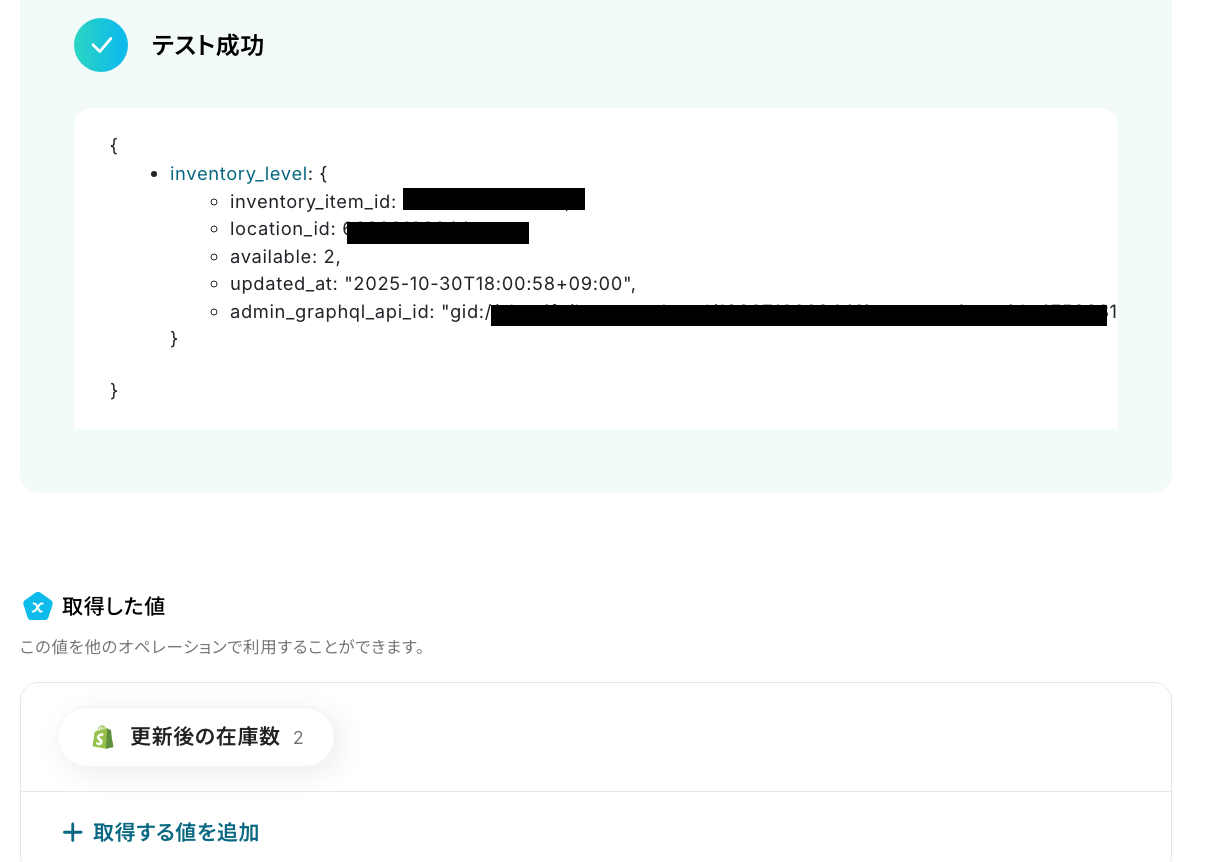 「テスト」をクリックしましょう! テストに成功すると取得した値が表示されます。 これにより、Google スプレッドシートで在庫数が閾値を下回った際に、Google スプレッドシートのデータをShopifyに同期するフローが完成しました。