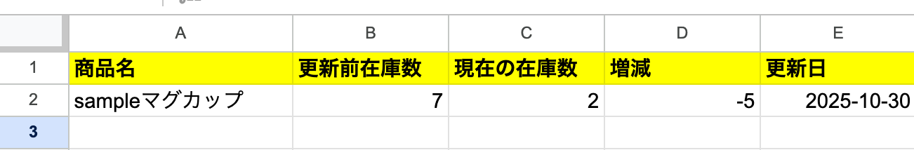 テストを行う前にGoogle スプレッドシートの画面に移り、C列の在庫数を更新します。 今回はテスト用に以下のシートを用意しました。 Google スプレッドシート上で更新が出来ていないとテストは成功しませんので、ご注意ください!