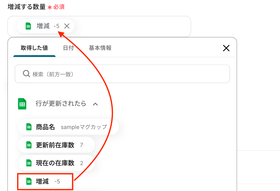 続いて、「増減する数量」 はGoogle スプレッドシートのトリガー設定で取得した値を引用して設定してください。
