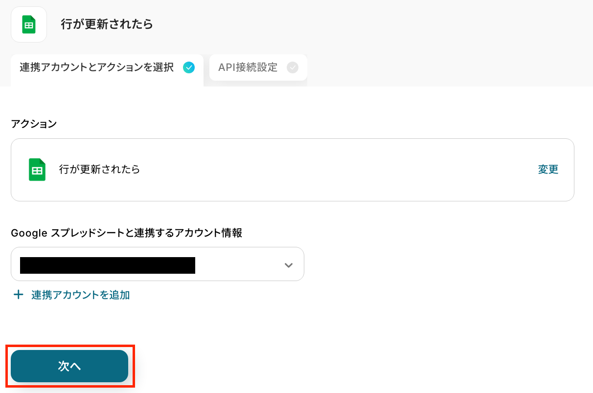 アクションはそのままで、連携するアカウント情報を確認します。 「次へ」をクリックして進みましょう!