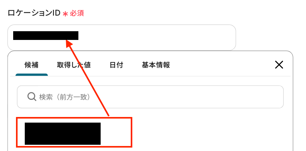 「ロケーションID」 は、入力欄をクリックして表示される候補から選択しましょう。
