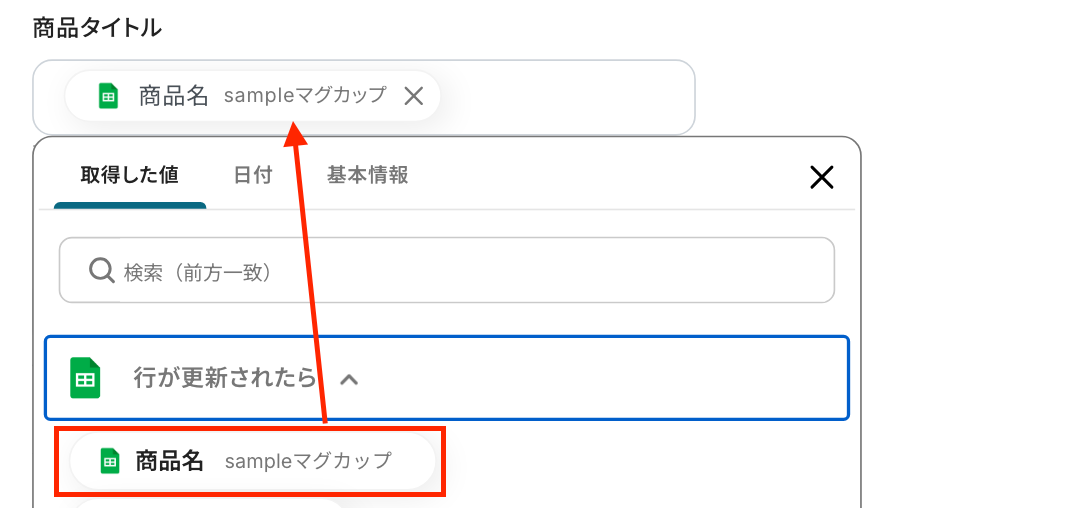 次の画面で、API接続設定を行います。「商品タイトル」 は入力欄をクリックして表示される取得した値を引用して設定してください。 他の項目は任意で設定します。 ※「商品タイトル」のみ設定すれば、テストは成功するので設定しなくても大丈夫です。