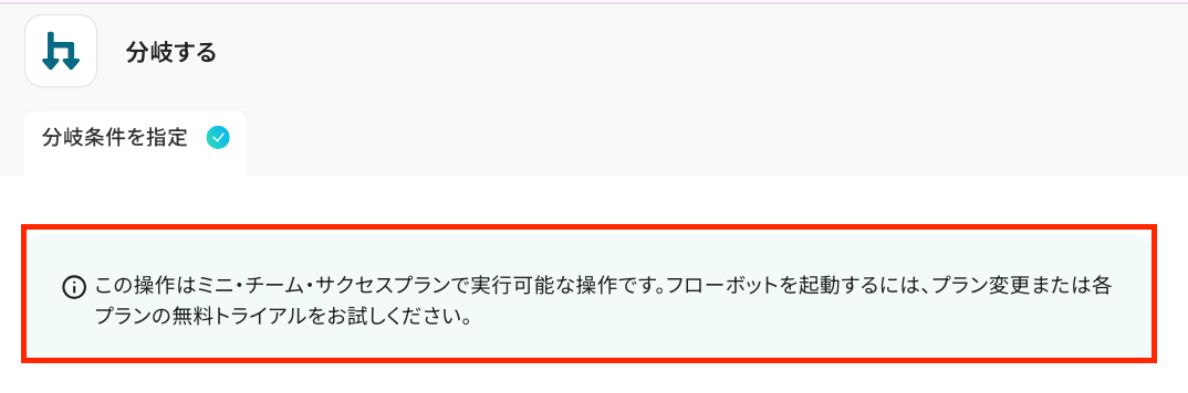 ※「分岐する」オペレーションは、ミニプラン以上でご利用いただけます。 フリープランで利用するとエラーになってしまうのでご注意ください。 ミニプランなどの有料プランは2週間の無料トライアルが可能です。 無料トライアル中なら、普段制限されているアプリや機能も自由にお試しいただけますので、ぜひ活用してみてください。