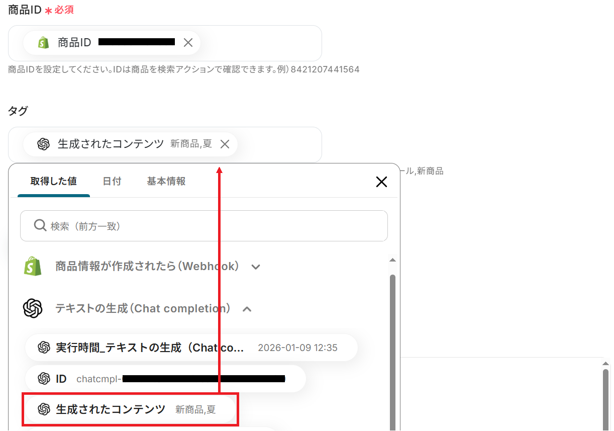 ステップ4:OpenAIのアクション設定 先ほど取得した商品情報をもとに、OpenAIで適切なタグを選定します。