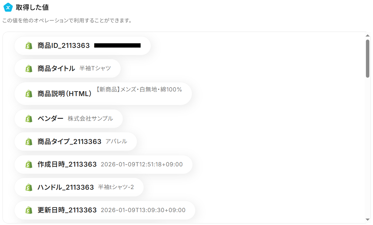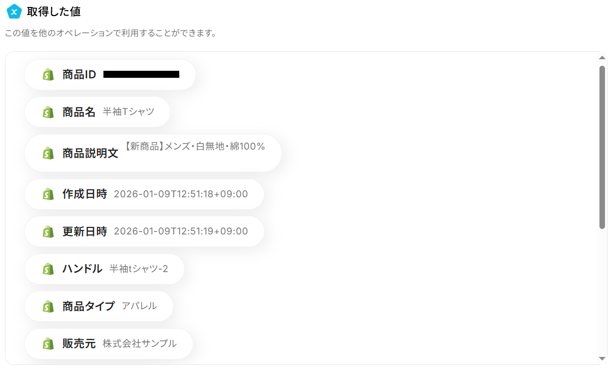 ※以下のように取得した値を設定することで、トリガーが実行されるたびに最新の商品情報が反映されます。