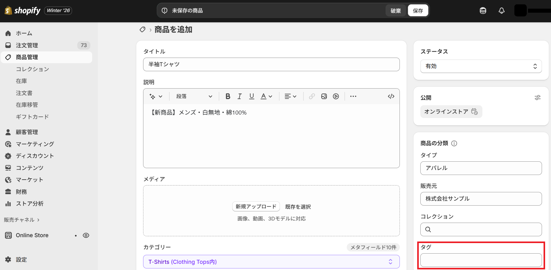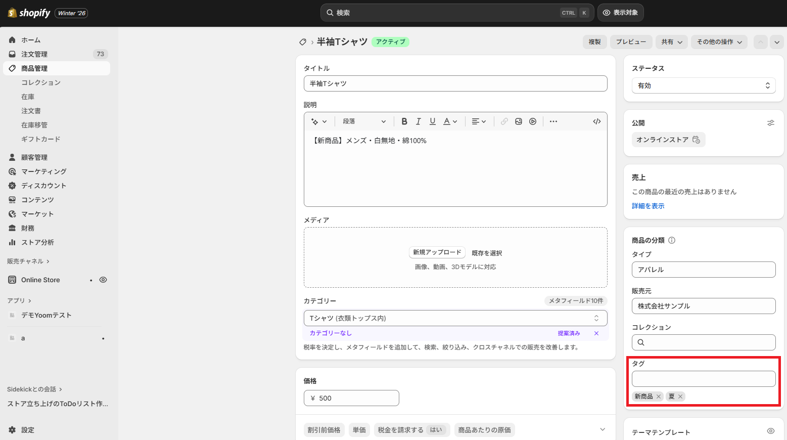成功したら保存してください。Shopifyの商品情報をもとに、OpenAIが適切なタグを選定してくれました!