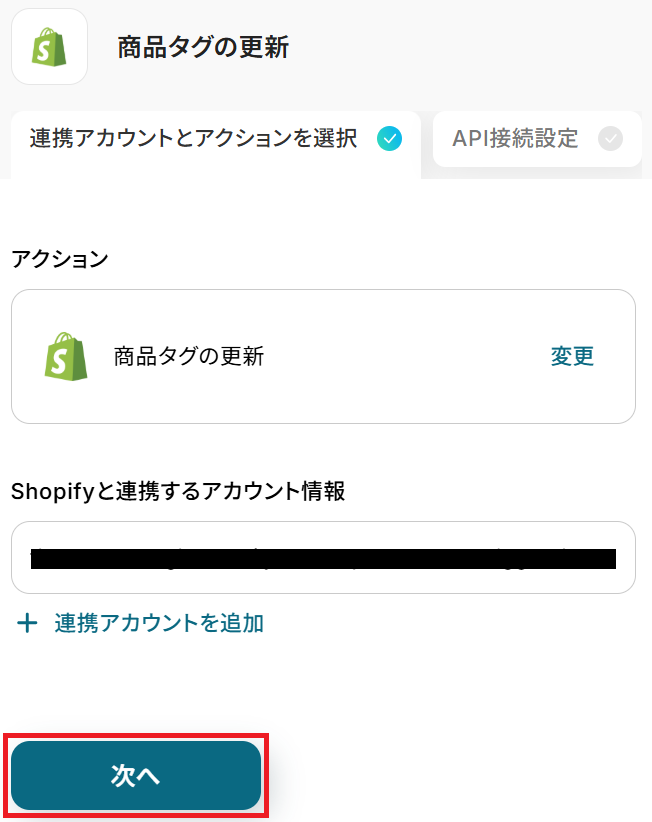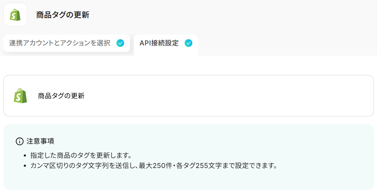 ステップ5:Shopifyのアクション設定 ステップ3で用意したShopifyの商品に、先ほど選定したタグを付けます。