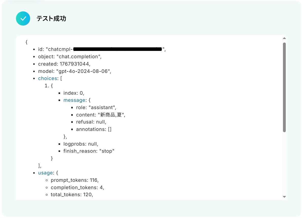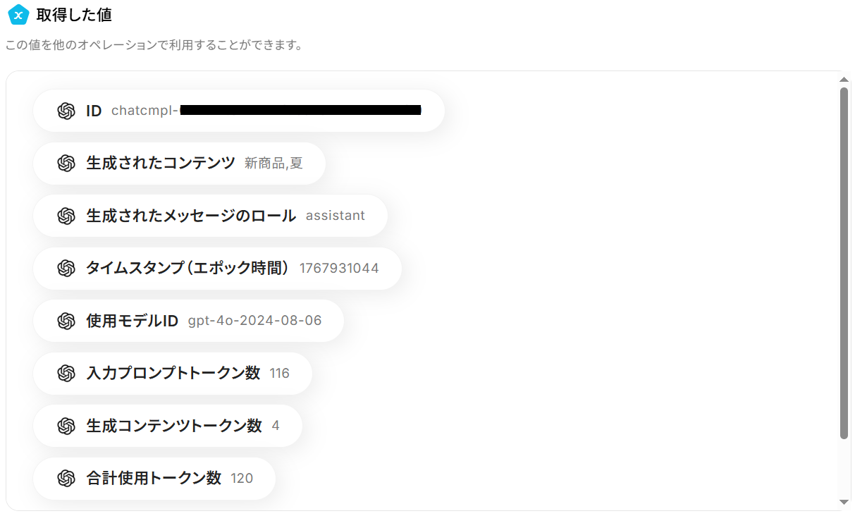タグ の欄にはOpenAIから取得した「生成されたコンテンツ」の値が予め設定されているので、そのままテストしてください。