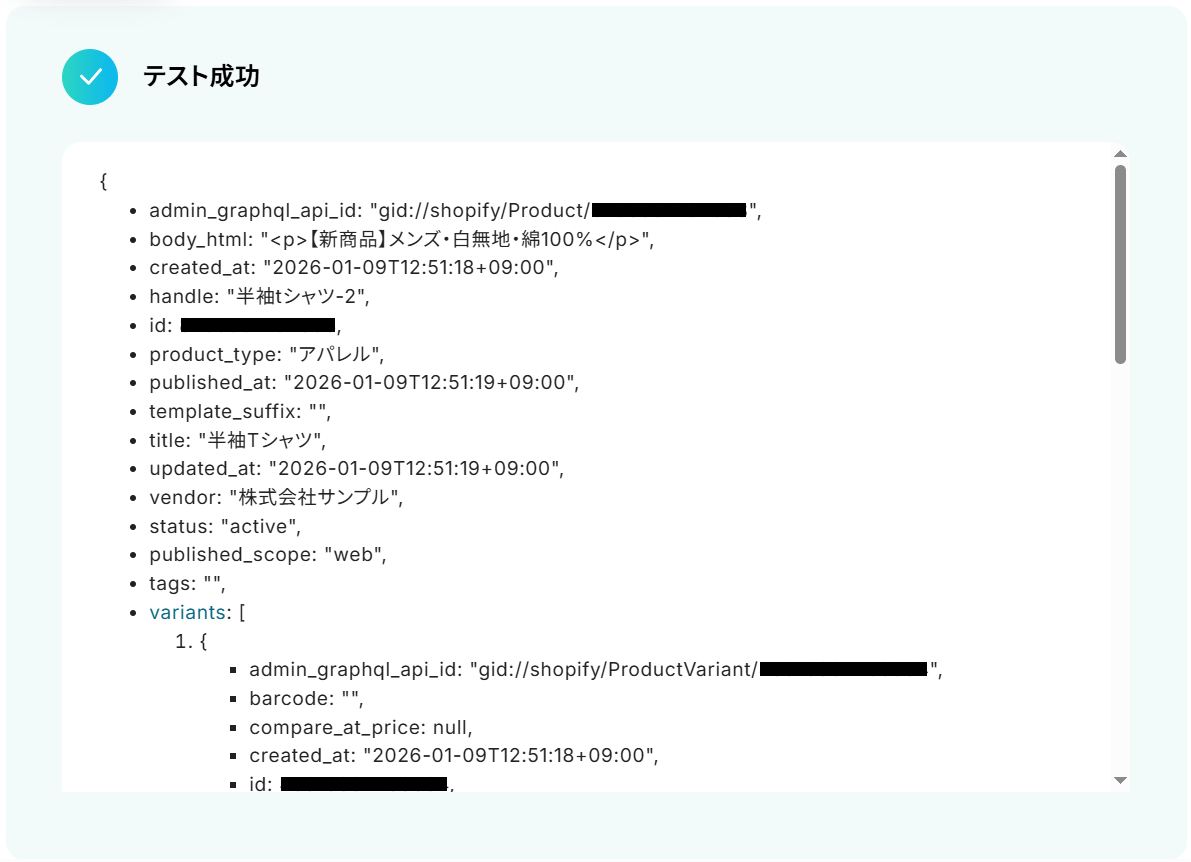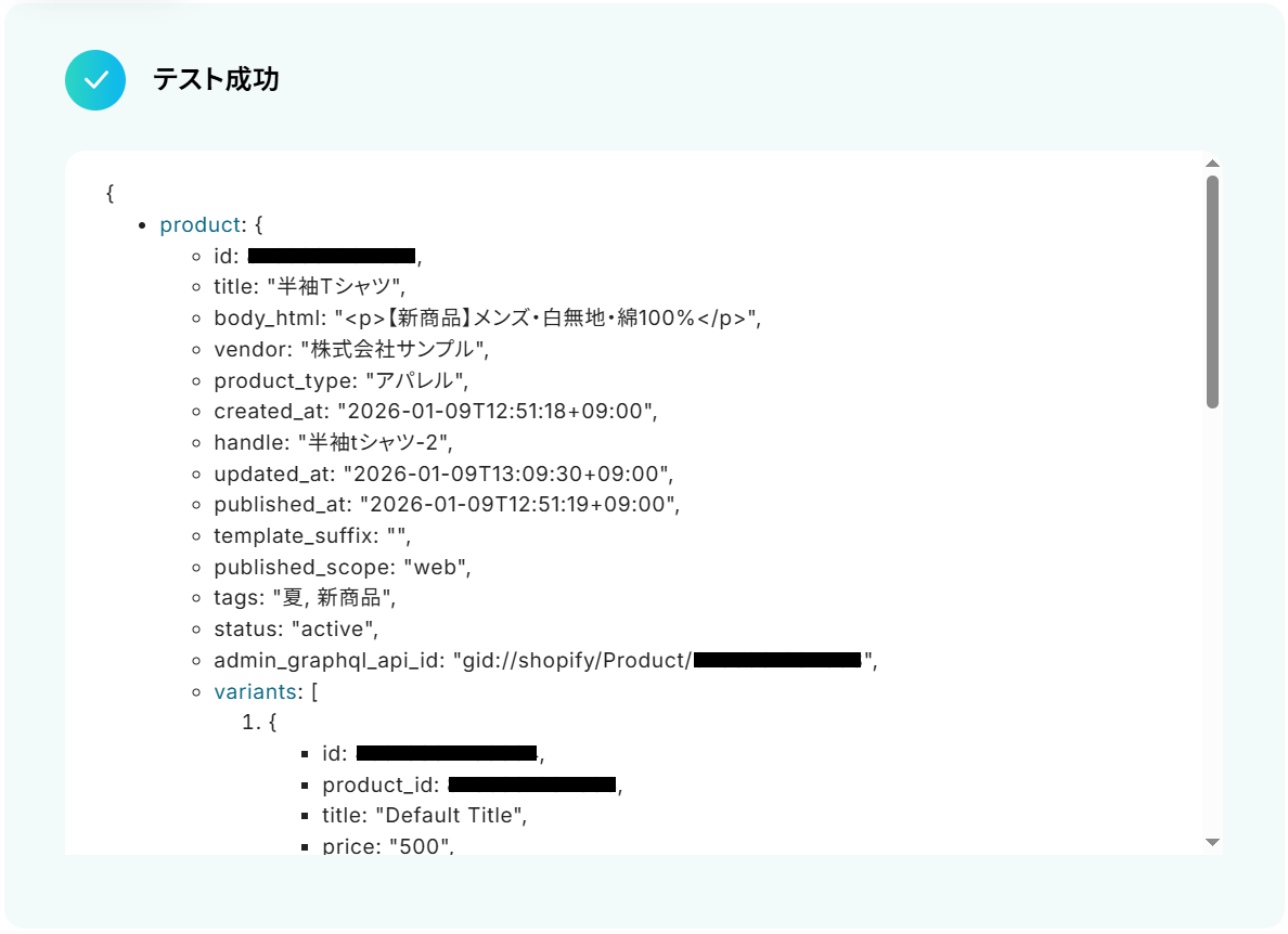 商品ID の欄にはShopifyから取得した「商品ID」の値が、