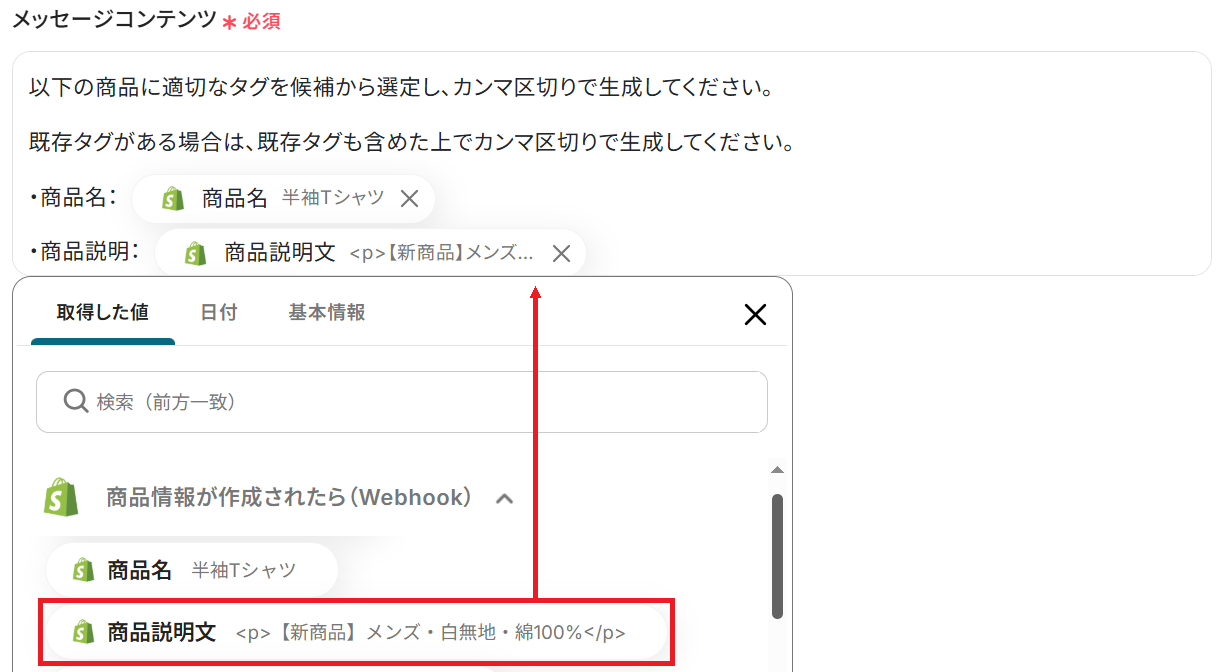 OpenAIでテキストを生成するオペレーションでは、どのような商品タグを生成したいか、指示内容(プロンプト)を任意で設定できます。例えば、SEOを意識したキーワードを含める、特定のフォーマットで出力するなど、目的に応じて調整が可能です。 ■注意事項
