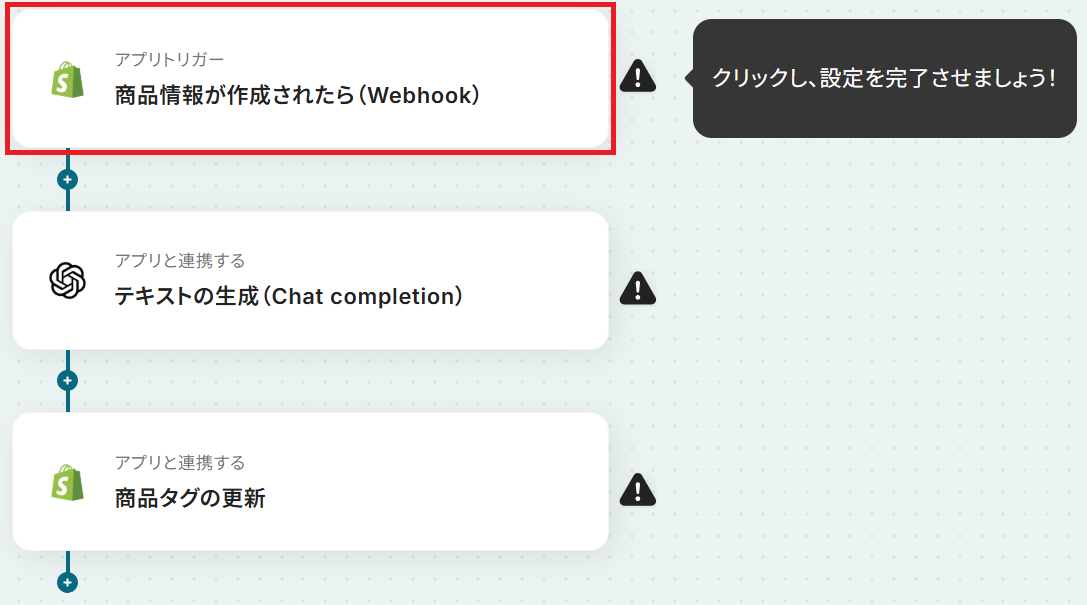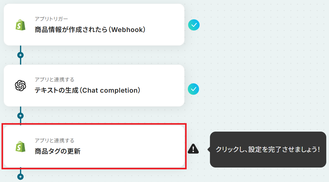 はじめに、ShopifyとOpenAIのアカウントをYoomと連携します。 次に、トリガーでShopifyを選択し、「商品情報が作成されたら(Webhook)」を設定します。 オペレーションでOpenAIを選択し、「テキストの生成(Chat completion)」を設定し、商品情報からタグを生成するよう指示します。 最後に、Shopifyの「商品タグの更新」アクションを設定し、前のステップで生成されたタグを対象の商品に反映させます。 ※「トリガー」:フロー起動のきっかけとなるアクション、「オペレーション」:トリガー起動後、フロー内で処理を行うアクション■このワークフローのカスタムポイント
