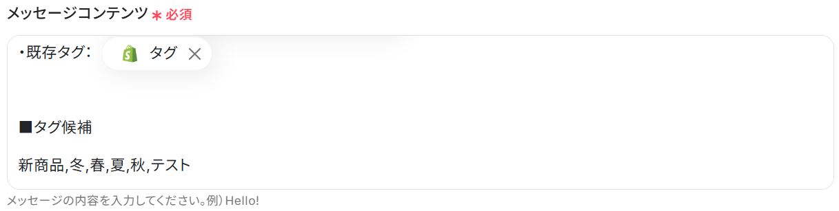 取得した値 を用いる動的なタグの他に、常に付与したい固定のタグがある場合はカンマ区切りで固定のテキストも追加しましょう。