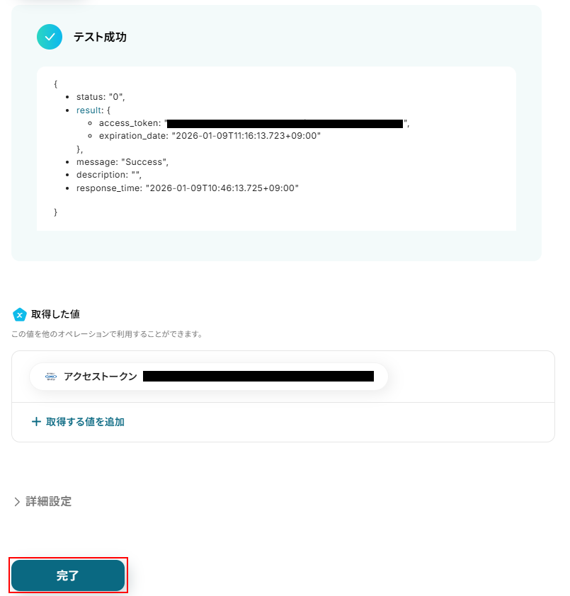 テストに成功するとテスト成功画面と取得した値が表示されますのでご確認ください。