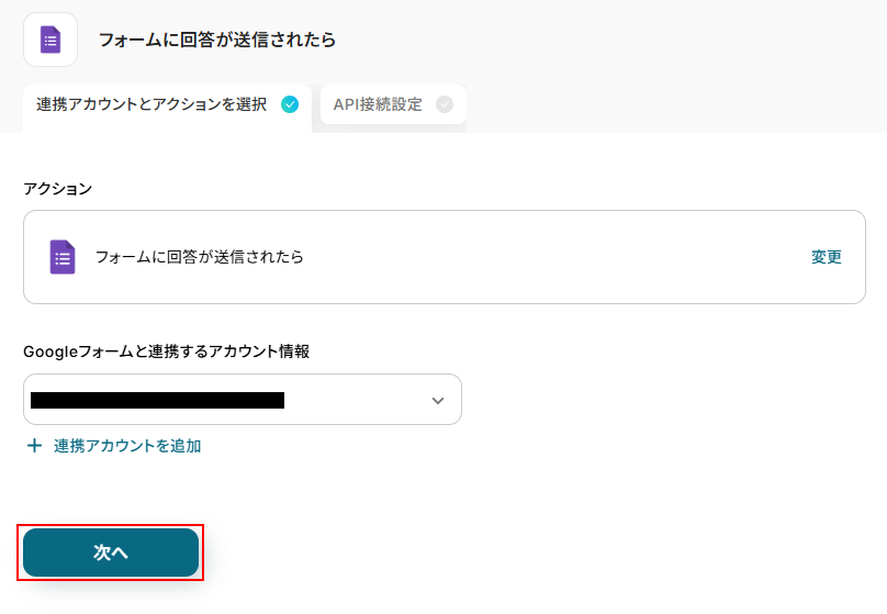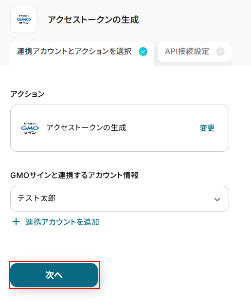 連携するアカウント情報にはステップ1で連携したアカウントか、連携時に使用していたYoomのアカウントが表示されます。