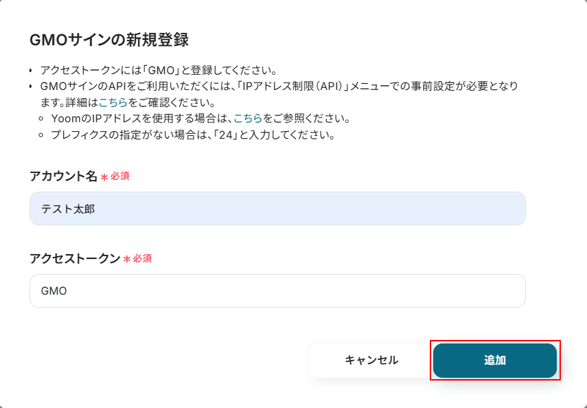 表示内容を確認し、任意のアカウント名、アクセストークンを設定したら追加をクリックします。