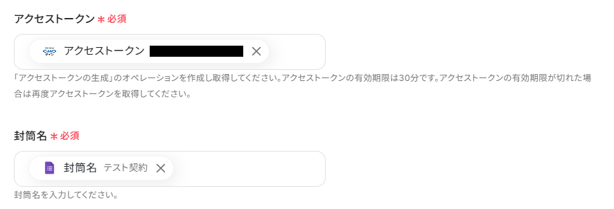 アクセストークン、封筒名にはデフォルトで取得した値が設定されています。