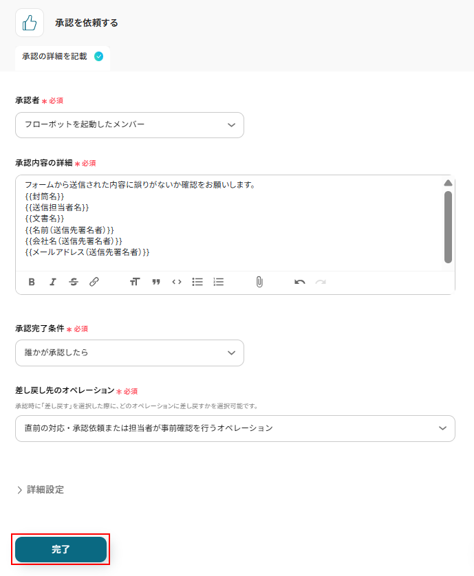承認内容の詳細はデフォルトで設定されていますが、自由に編集可能です。