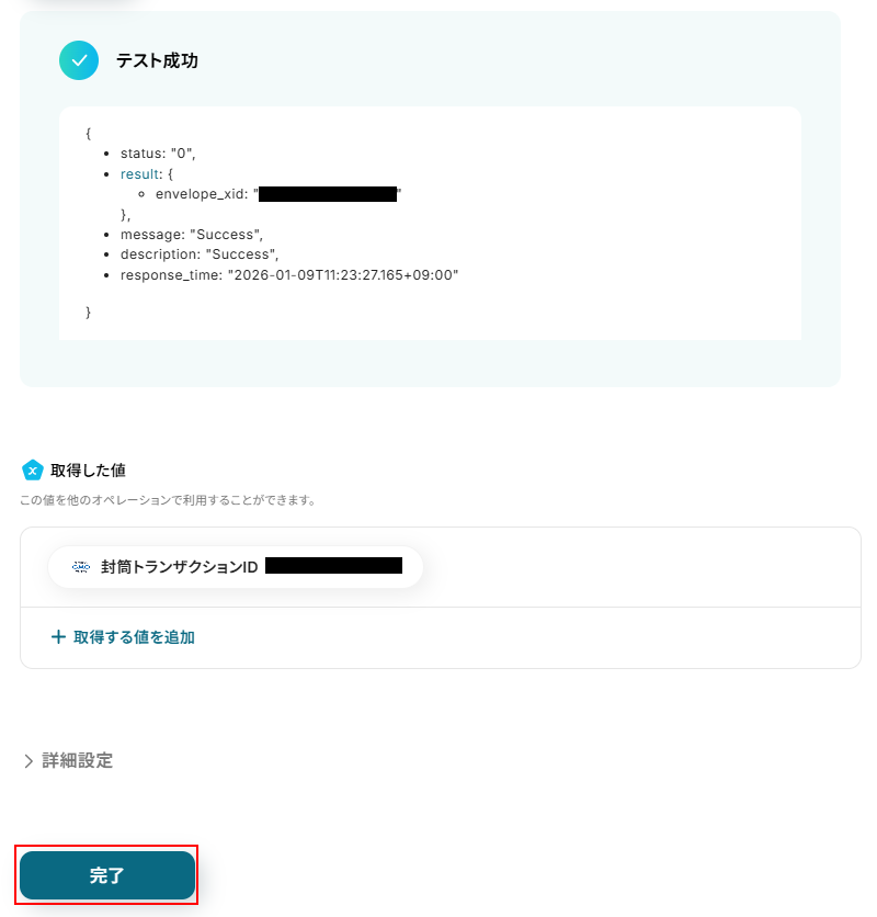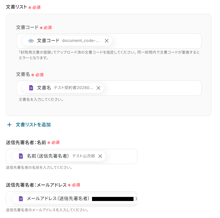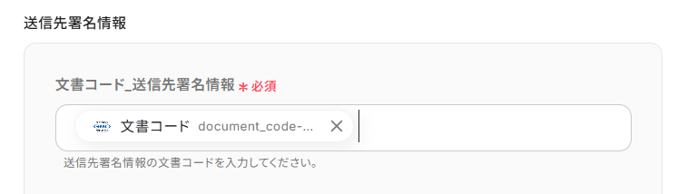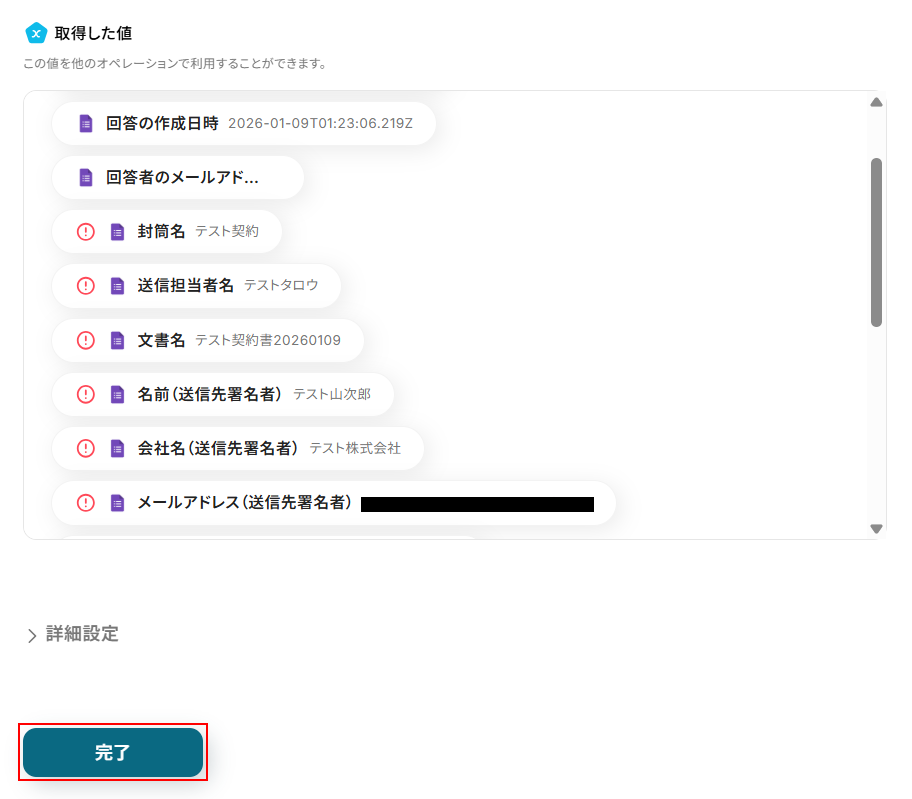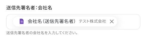 送信先署名者:会社名、文章コード_送信先署名情報にも取得した値が設定されていますので、項目名と値を確認しておきましょう。