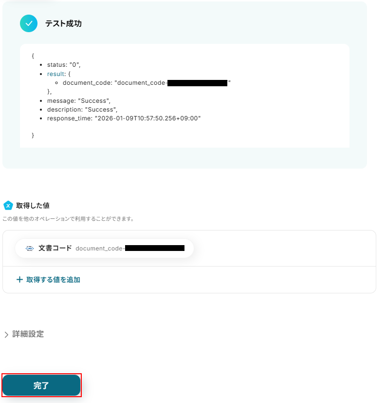 取得した値は実行した結果が設定される動的な値として利用できるため、このあとの設定でも使用します。