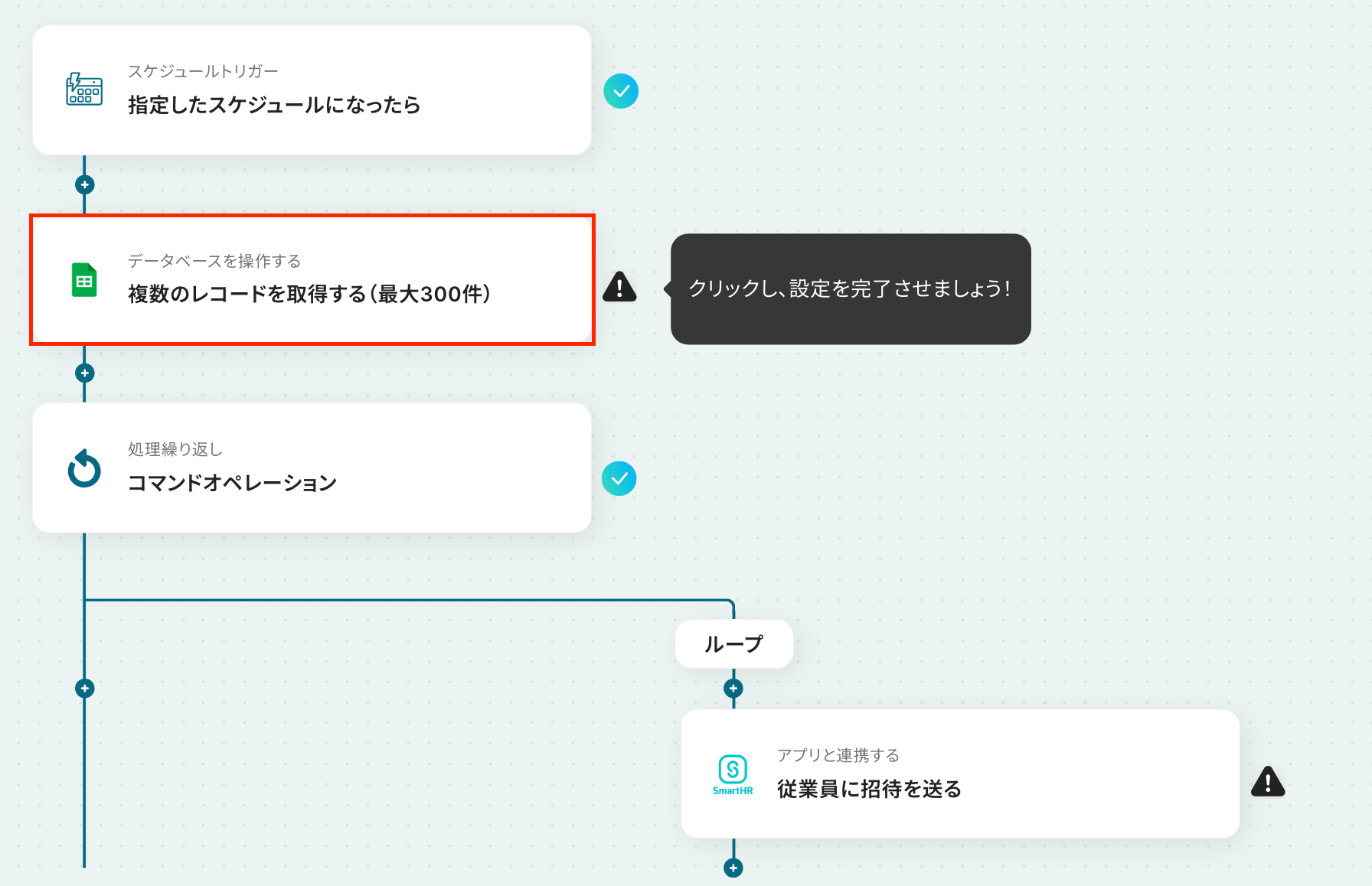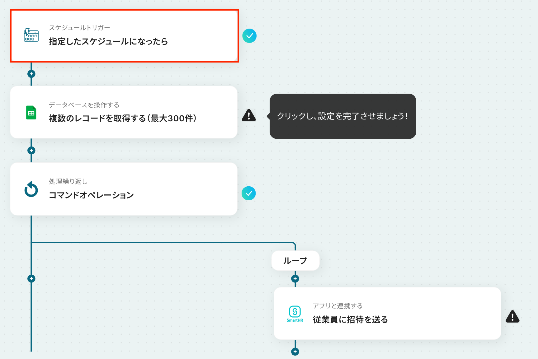 ここから「毎日、Google スプレッドシートからSmartHRに未招待の従業員を抽出し一括で招待する」フローの設定をしていきます!