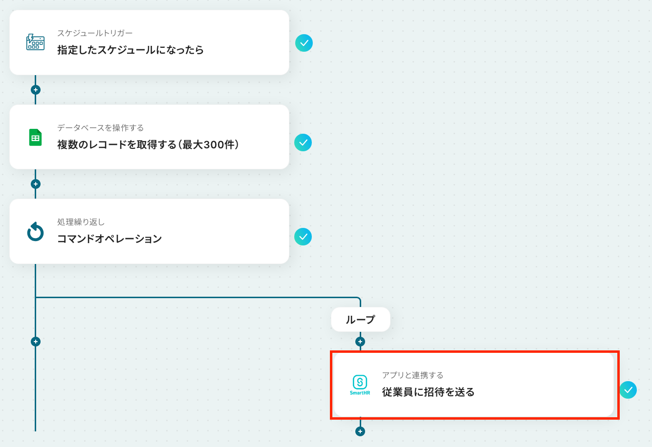 このワークフローは、Google スプレッドシートに従業員リストを用意するだけで、未招待の従業員を自動で抽出し、SmartHRへの招待を定期的に実行します。