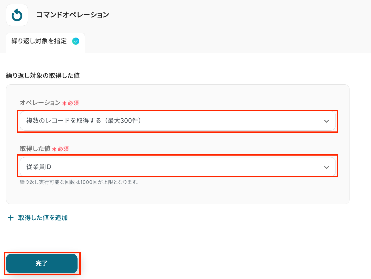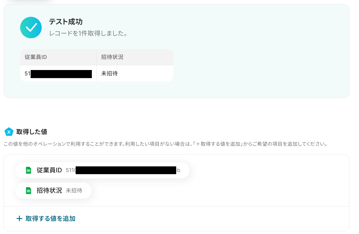 「取得した値」は、先ほどのステップで取得した「従業員ID」を設定しましょう!