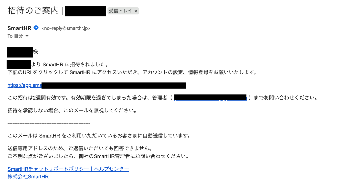 テストに成功すると、対象の従業員の登録メールアドレス宛に、SmartHRから招待メールが送信されます。