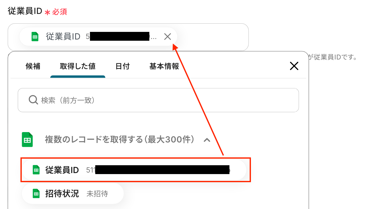 次の画面で「従業員ID」を設定しましょう!入力欄をクリックし、Google スプレッドシートのトリガー設定で取得した値から選択してください。