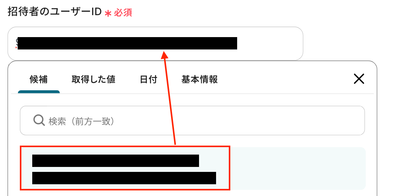 「招待者のユーザーID」を設定しましょう!入力欄をクリックして表示される候補から選択してください。