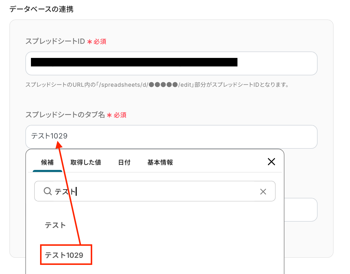 続いて、「スプレッドシートID」と「スプレッドシートのタブ名」を設定します。