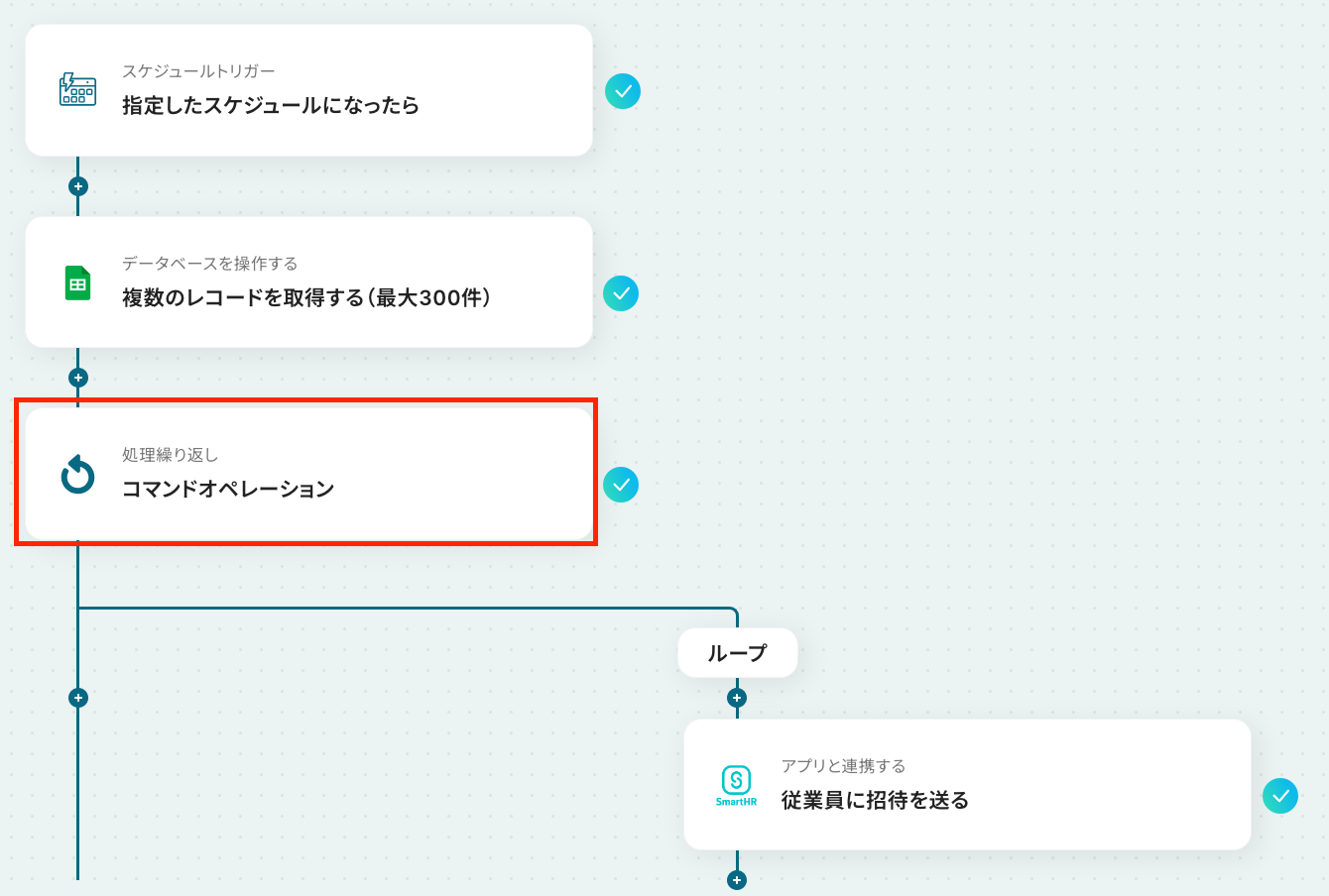 「同じ処理を繰り返す」オペレーションは、チームプラン・サクセスプランでのみご利用いただける機能となっております。