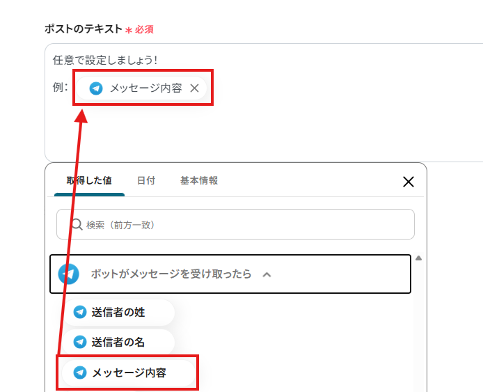 「ポストのテキスト」は、入力欄をクリックして表示されるアウトプット(取得した値)から選択してください。
