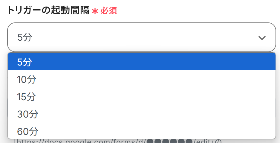 トリガーの起動間隔:5分、10分、15分、30分、60分の間隔で起動間隔を選択できます。