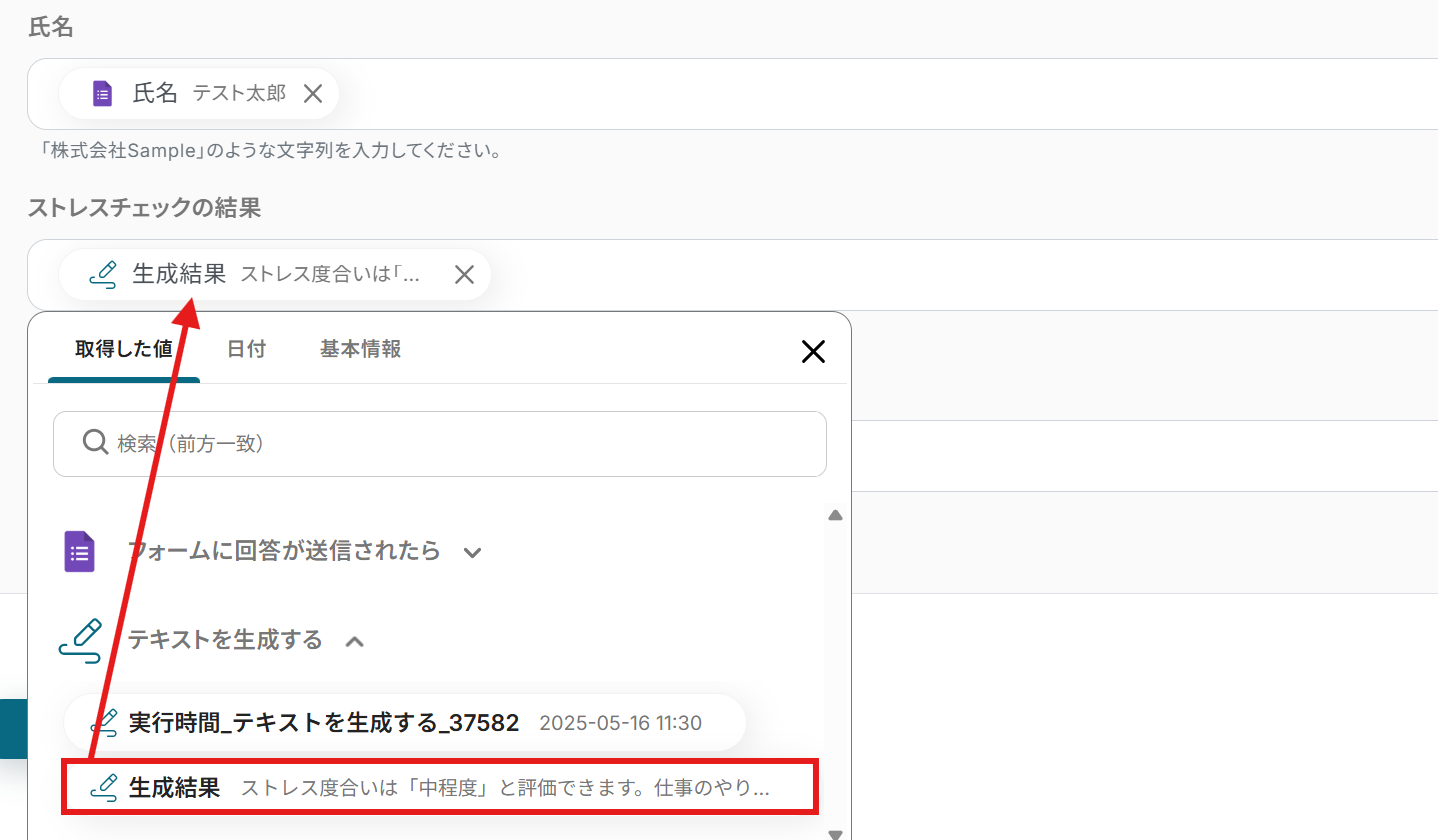※氏名や結果を手入力してしまうと毎回同じ内容がNotionに追加されてしまうので、必ず「取得した値」から選択してください。